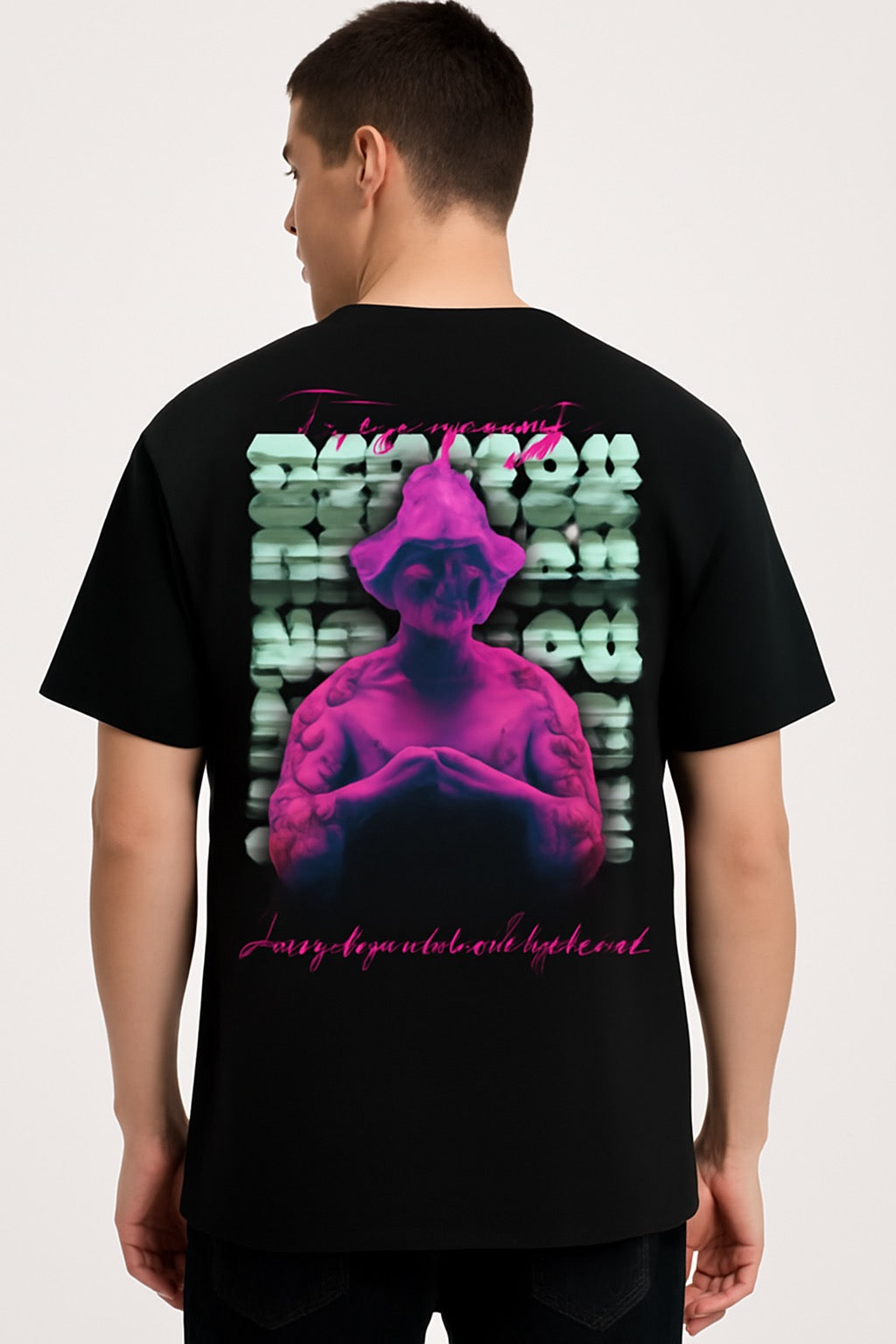 black T-shirt featuring a bold, urban streetwear design. The focal point is a grayscale statue...