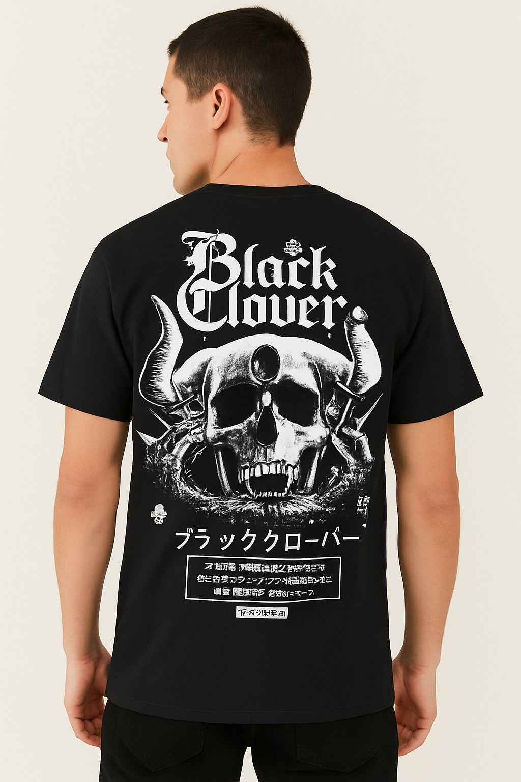 This black t-shirt features a bold “Black Clover” graphic across the back, highlighted by a...
