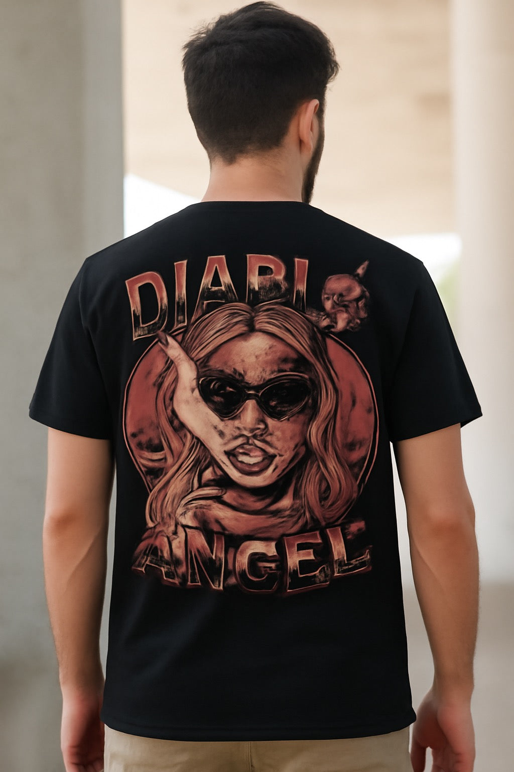This graphic tee makes a bold statement with its dramatic “DIABLI ANGEL” theme, featuring an...