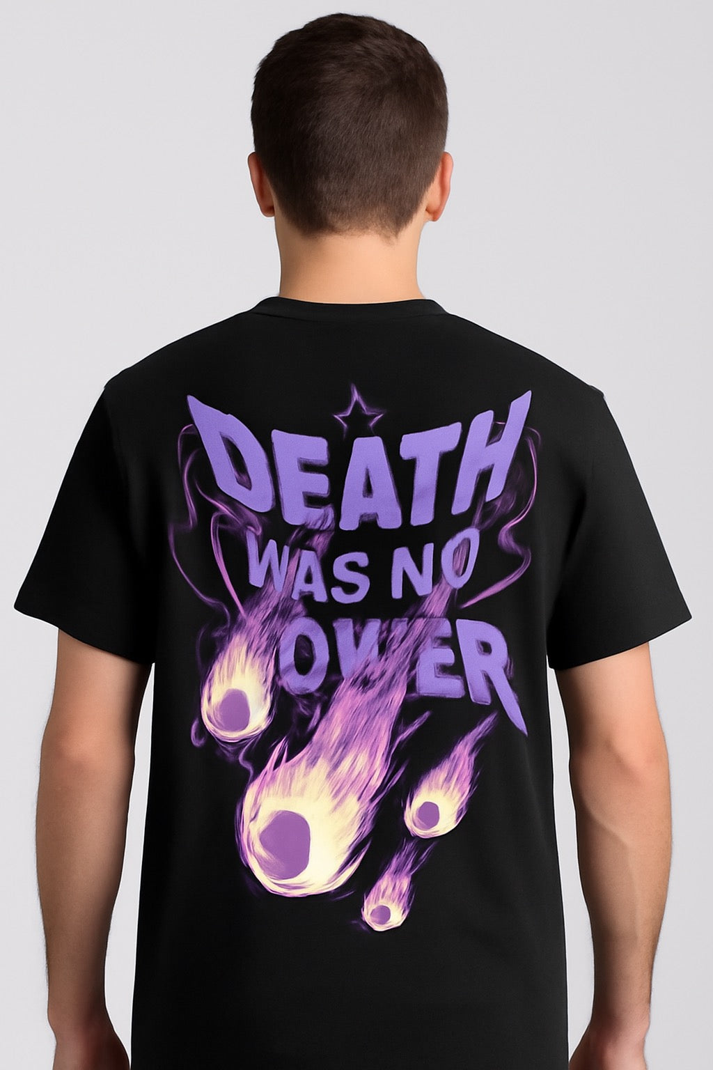 This is a striking black t-shirt featuring bold purple text that reads “DEATH WAS NO...