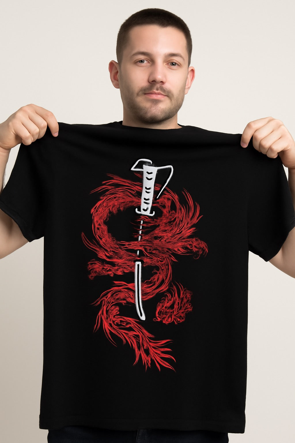 This striking t-shirt features a dynamic red dragon intertwined with a bold white katana, creating...