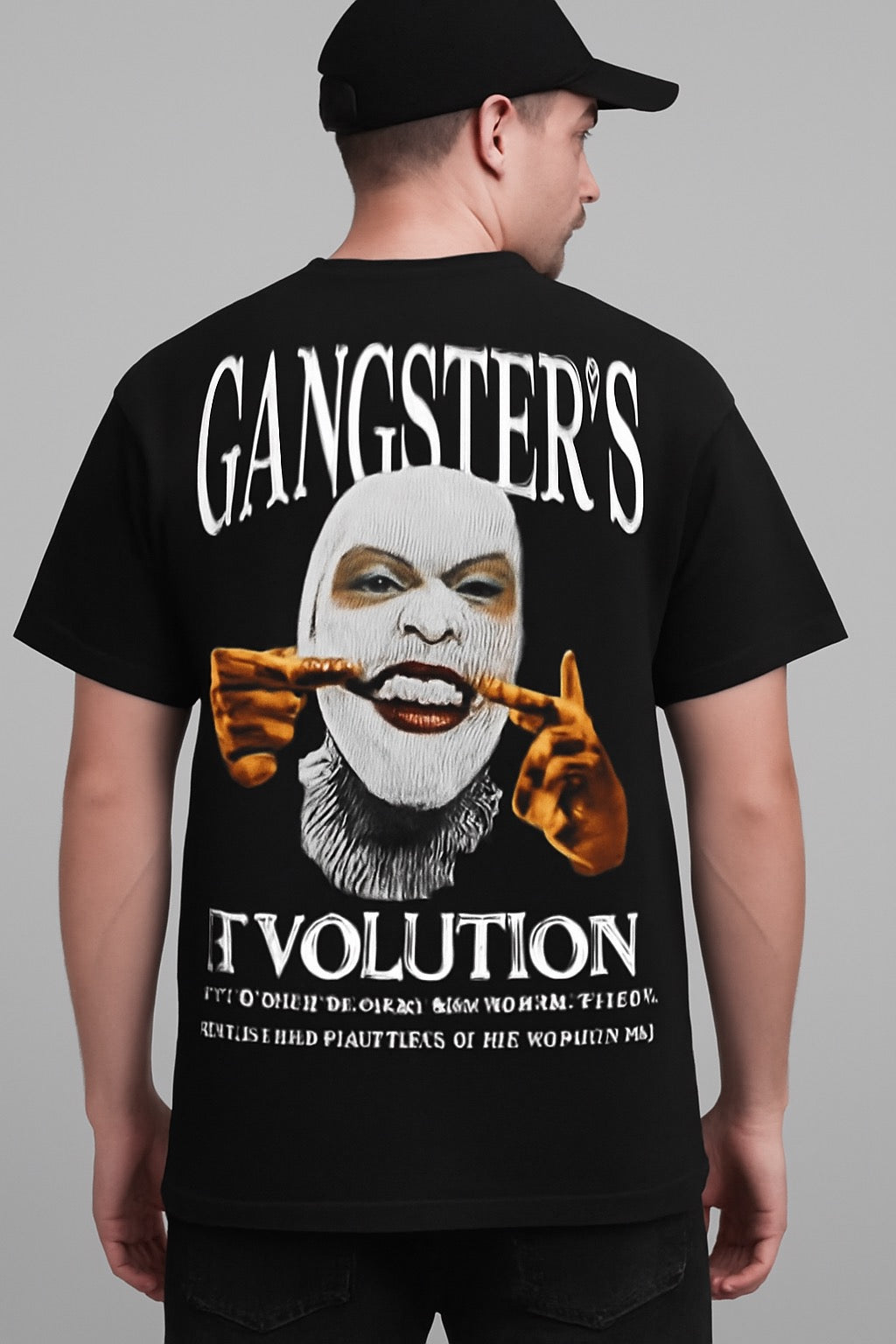 black T-shirt featuring a bold, urban streetwear design. The focal point is a grayscale statue...